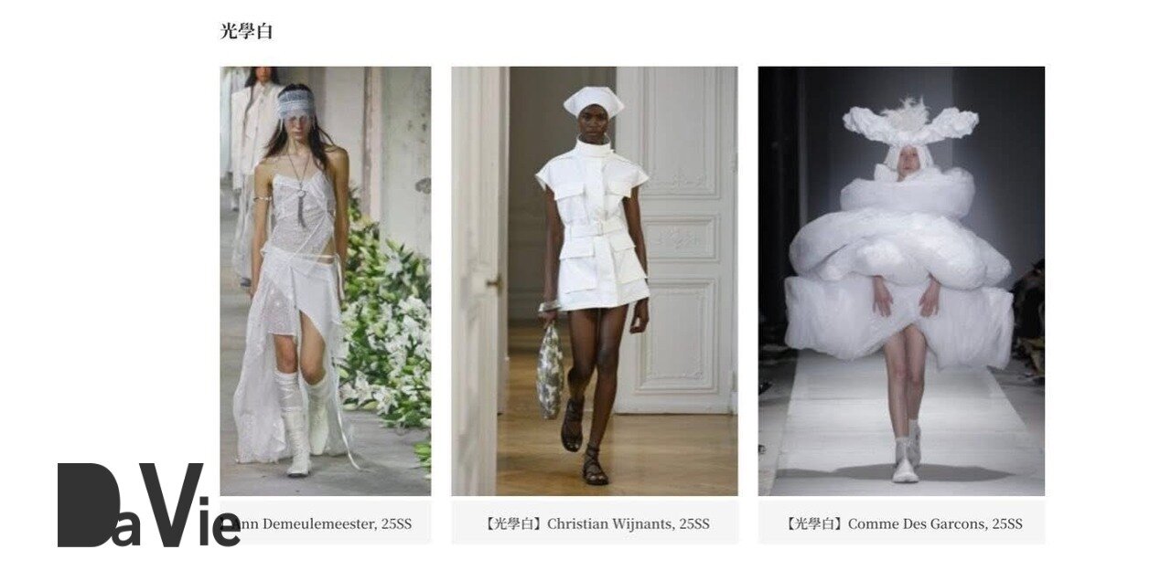 「白色」巴黎時裝週幾乎每一種面料都可以看見關鍵白色~白色在光線的作用下,明度與飽和度被提升至純粹無瑕,猶如透過光學透鏡的放大效果般,展現出冷冽而嚴謹的質感。這樣的純白調性不僅去除雜質,讓經典元素焕然一新。